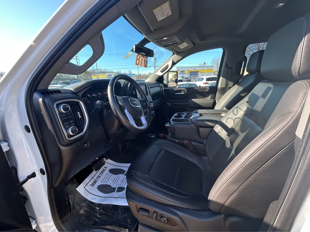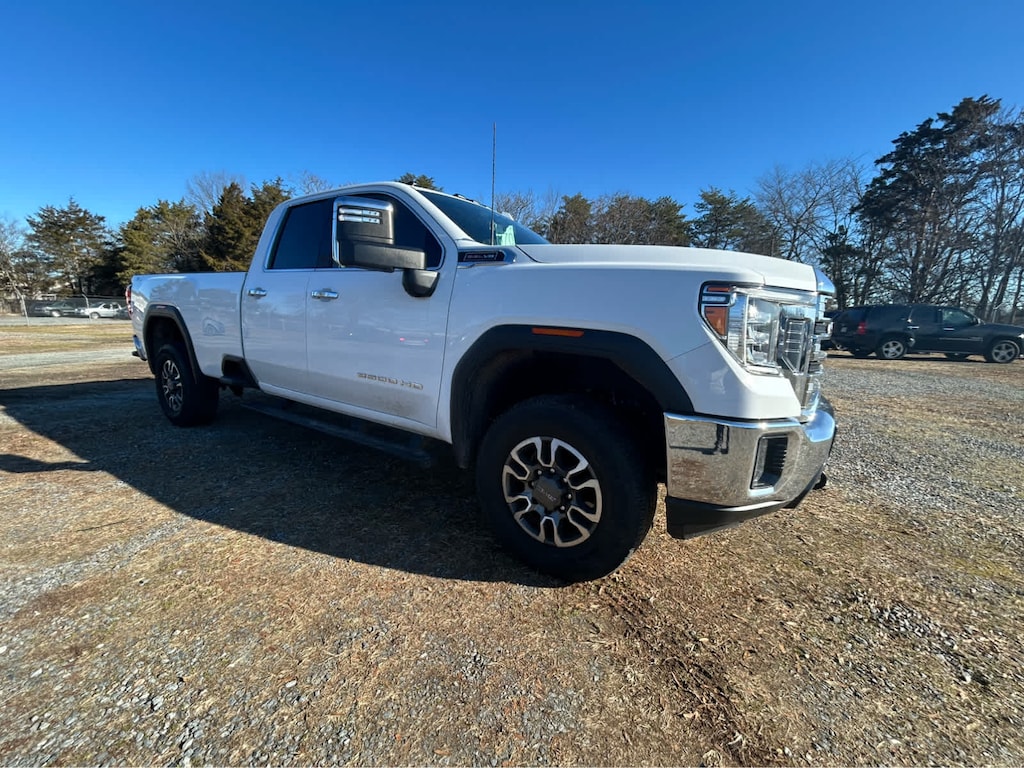BED LINER, SPRAY-ON, PICKUP BEDLINER WITH GMC LOGO (does not include spray-on liner on tailgate due to Black composite inner panel), AUDIO SYSTEM, PREMIUM GMC INFOTAINMENT SYSTEM WITH 8 DIAGONAL COLOR TOUCH-SCREEN includes multi-touch display, AM/FM stereo, Bluetooth® streaming audio for music and most phones; featuring wireless Android Auto® and Apple CarPlay® capability for compatible phones, advanced voice recognition, in-vehicle apps, personalized profiles for infotainment and vehicle settings (STD) (Includes (PZ8) Hitch Guidance with hitch view.), ENGINE, 6.6L V8 with Direct Injection and Variable Valve Timing, gasoline, (401 hp [299 kW] @ 5200 rpm, 464 lb-ft of torque [629 N-m] @ 4000 rpm) (STD), TRANSMISSION, 6-SPEED AUTOMATIC, HEAVY-DUTY (STD). GMC SLT with Summit White exterior and Jet Black interior features a 8 Cylinder Engine with 401 HP at 5200 RPM*.